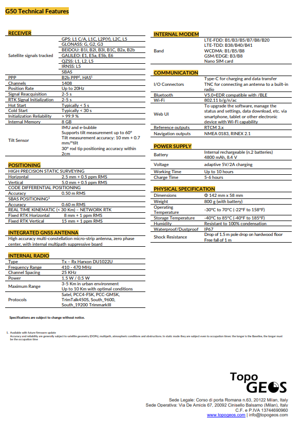 Ο G50 είναι ένας συμπαγής, ελαφρύς και εξαιρετικά αξιόπιστος δέκτης GNSS, σχεδιασμένος για επαγγελματικές εφαρμογές τοπογραφίας και χαρτογράφησης.